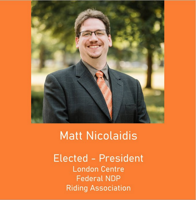 Congratulations Matt Nicolaidis, and many thanks to all of the London Centre NDP members who have stepped up to positions on the Riding Association Executive. Note: If you wish to participate on the Executive, please contact us.